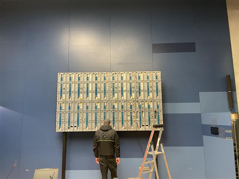 Monté sur une structure sur mesure conçue par B-Tech AV Mounts, cet écran s’intègre parfaitement dans l’architecture de la salle tout en garantissant robustesse, sécurité et esthétique.